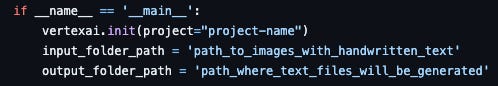 Initiate Vertex AI with a project name, and then define the input and output folder paths. The input folder will contain the images that we want to convert to text, and these text files will be saved in the output folder.