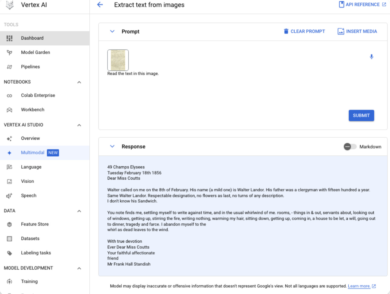 It’s a new Multimodal AI with visual capabilities that Google recently released (in December 2023). It boasts impressive visual and inference capabilities, and we will be experimenting with its handwritten text extraction use case.