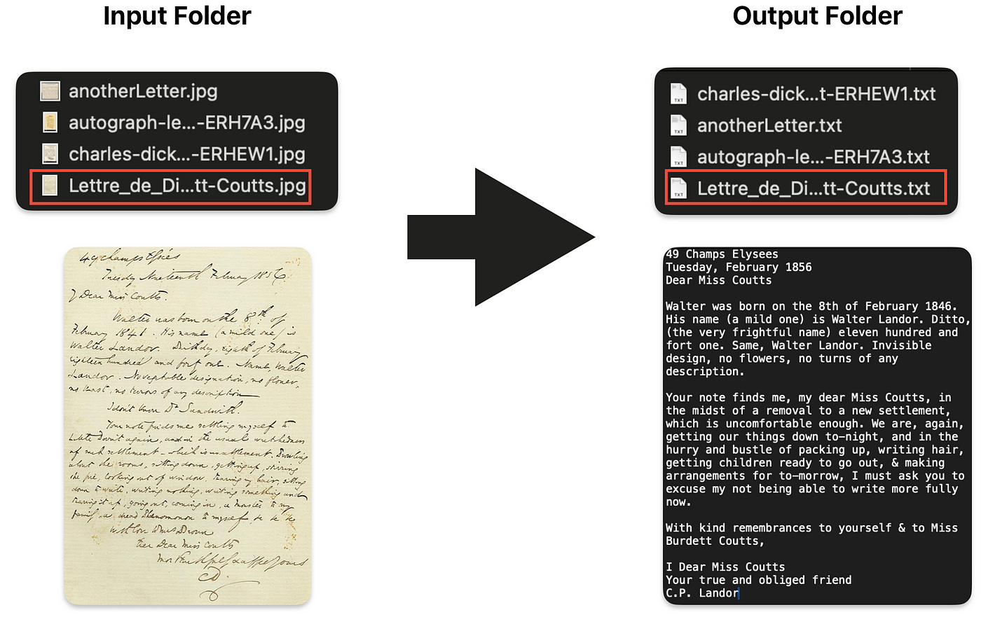 The output will look like the following: on the left, we have the handwritten images in the input folder, and on the right, the converted text in the output folder.